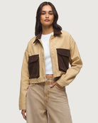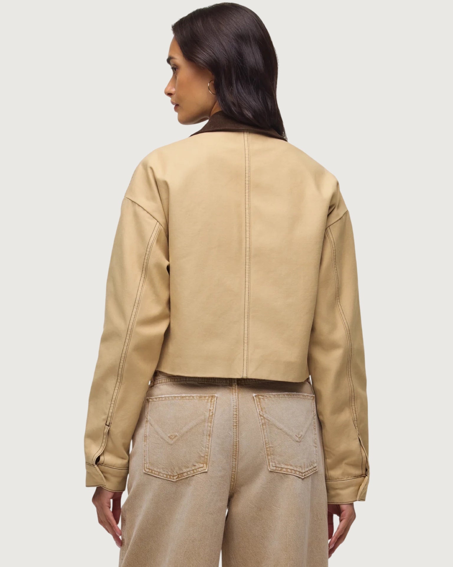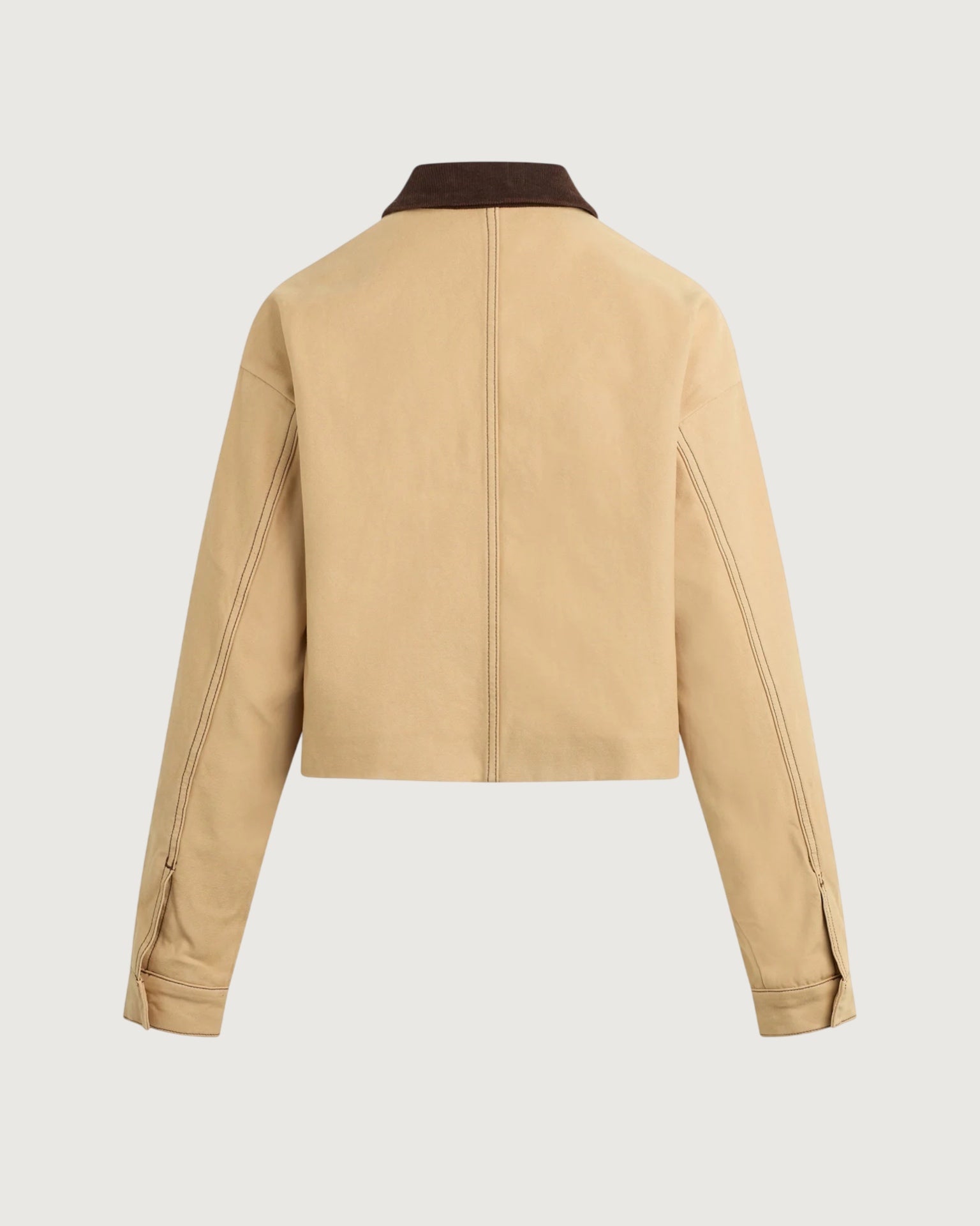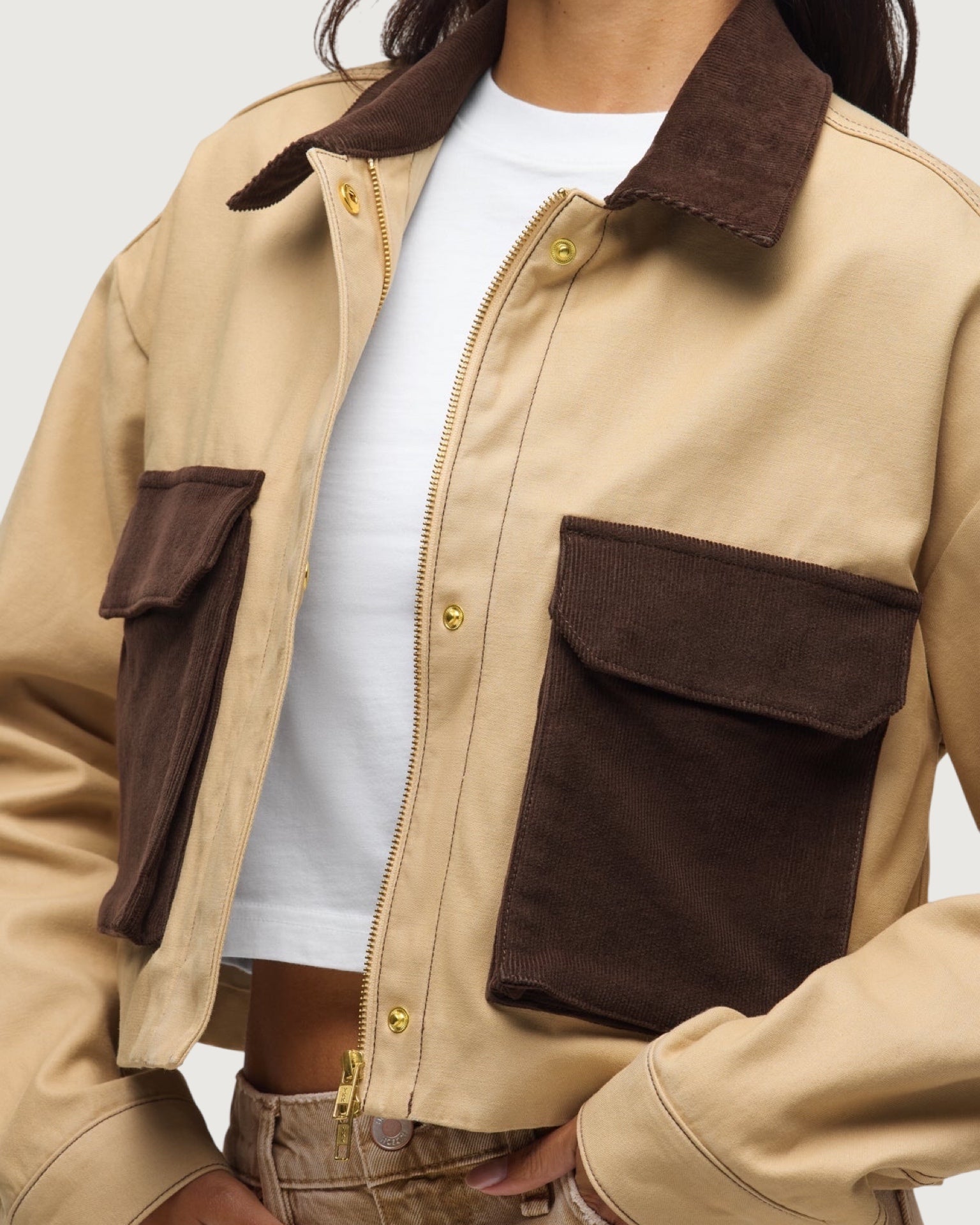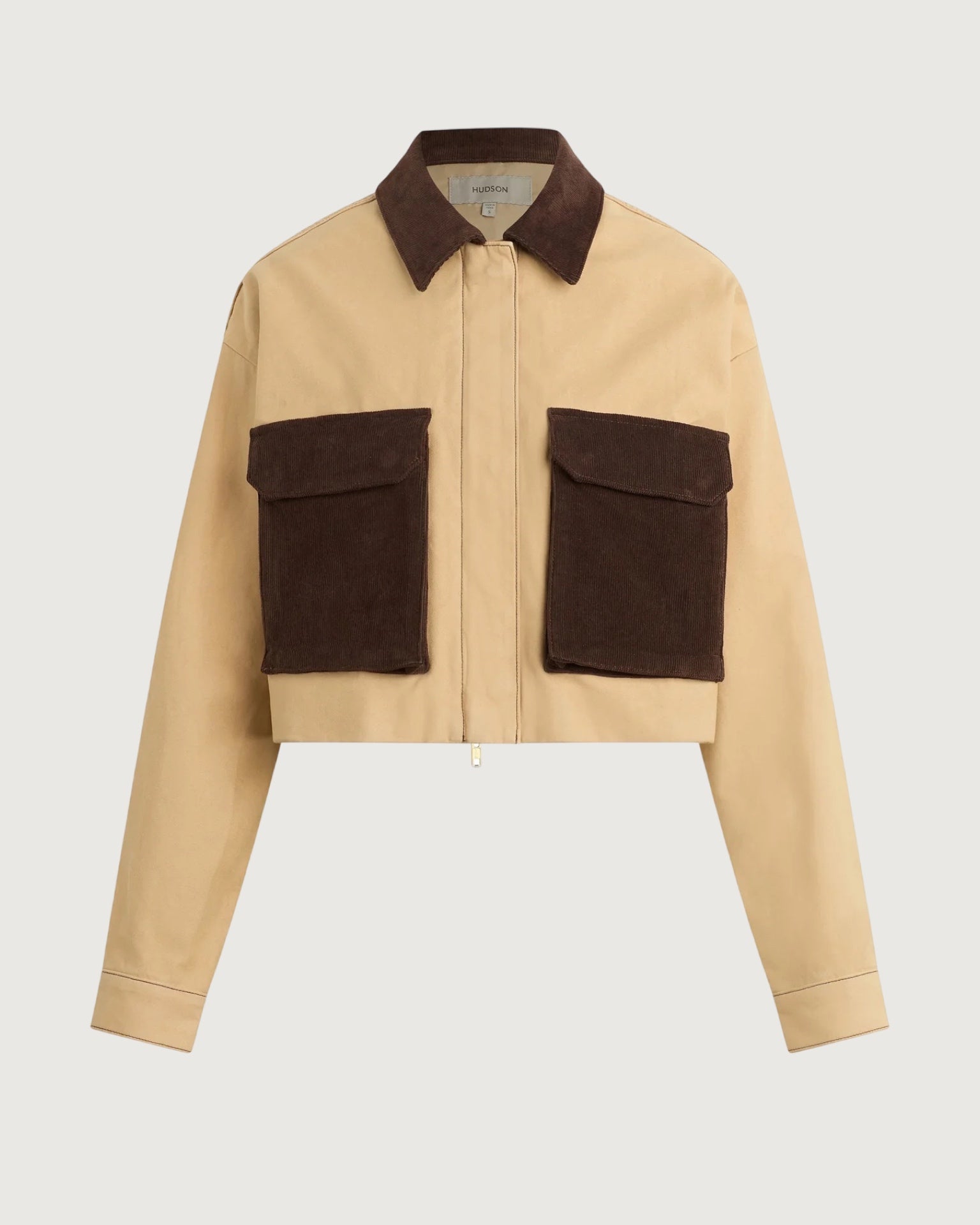 canvas jacket with contrasting corduroy collar and pockets, fully lined, zipper and button closure