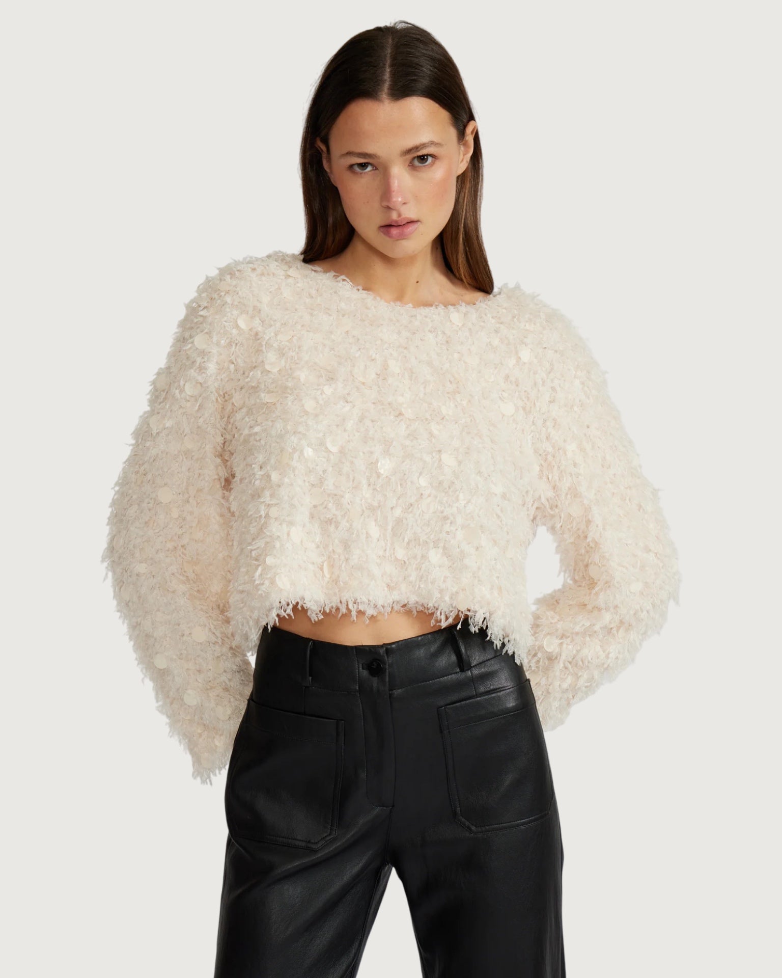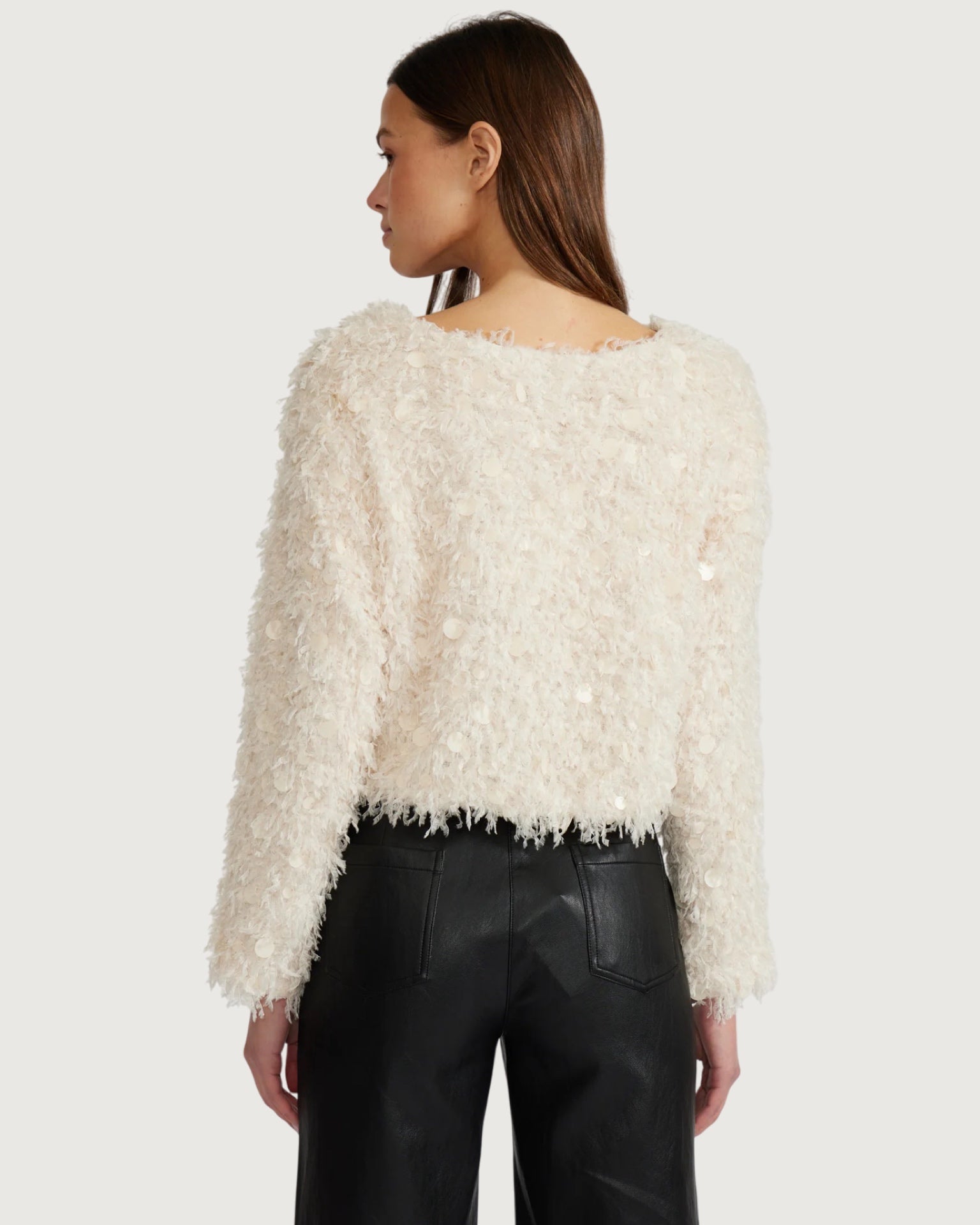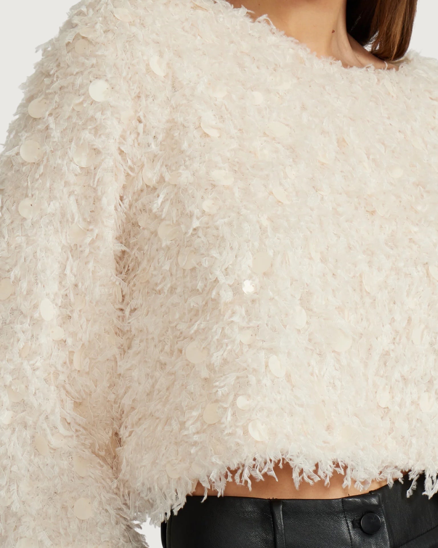 fuzzy knit fabrication with sequin detail, crew neckline, pullover