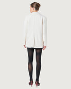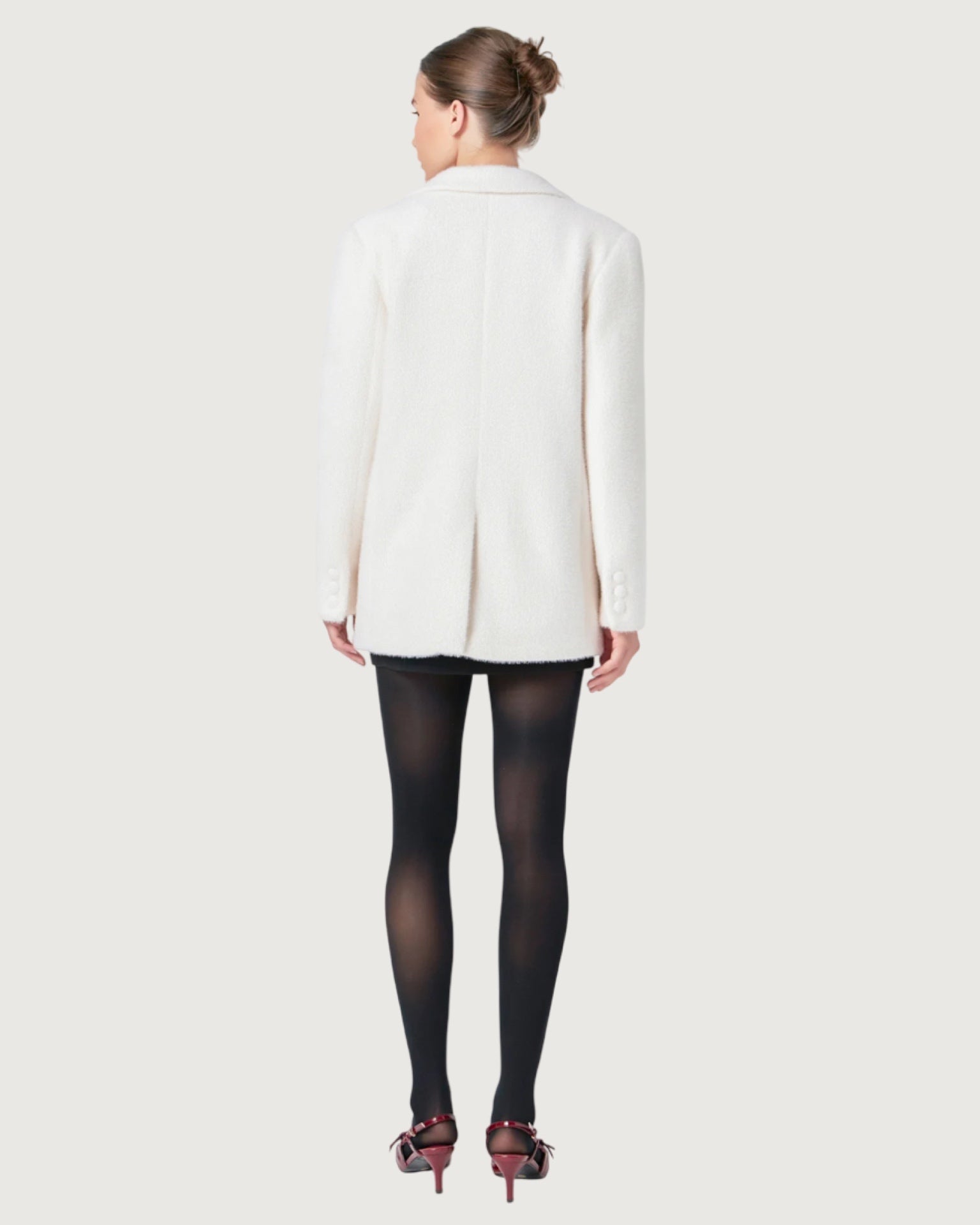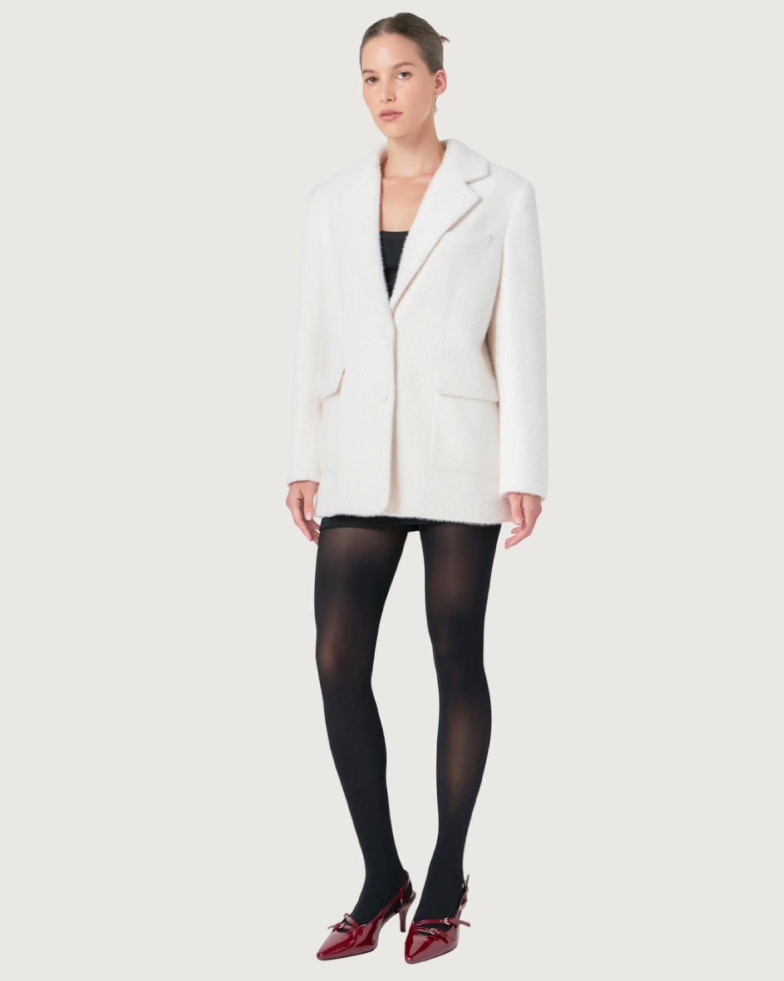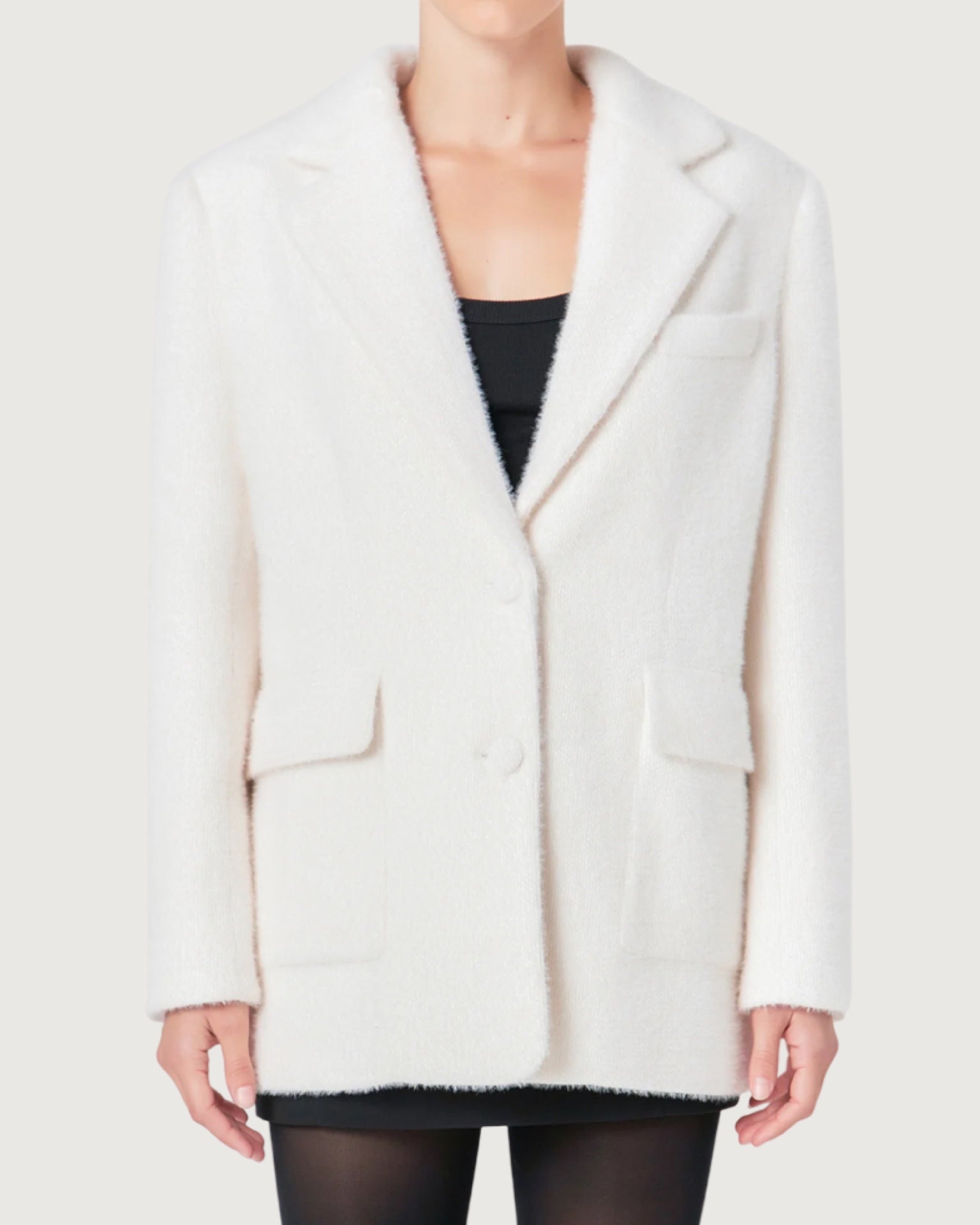 soft fuzzy buttoned blazer, lapel, collar, 2 front buttons, 3 buttons on sleeve, flap pocket, single chest welt pocket, lined