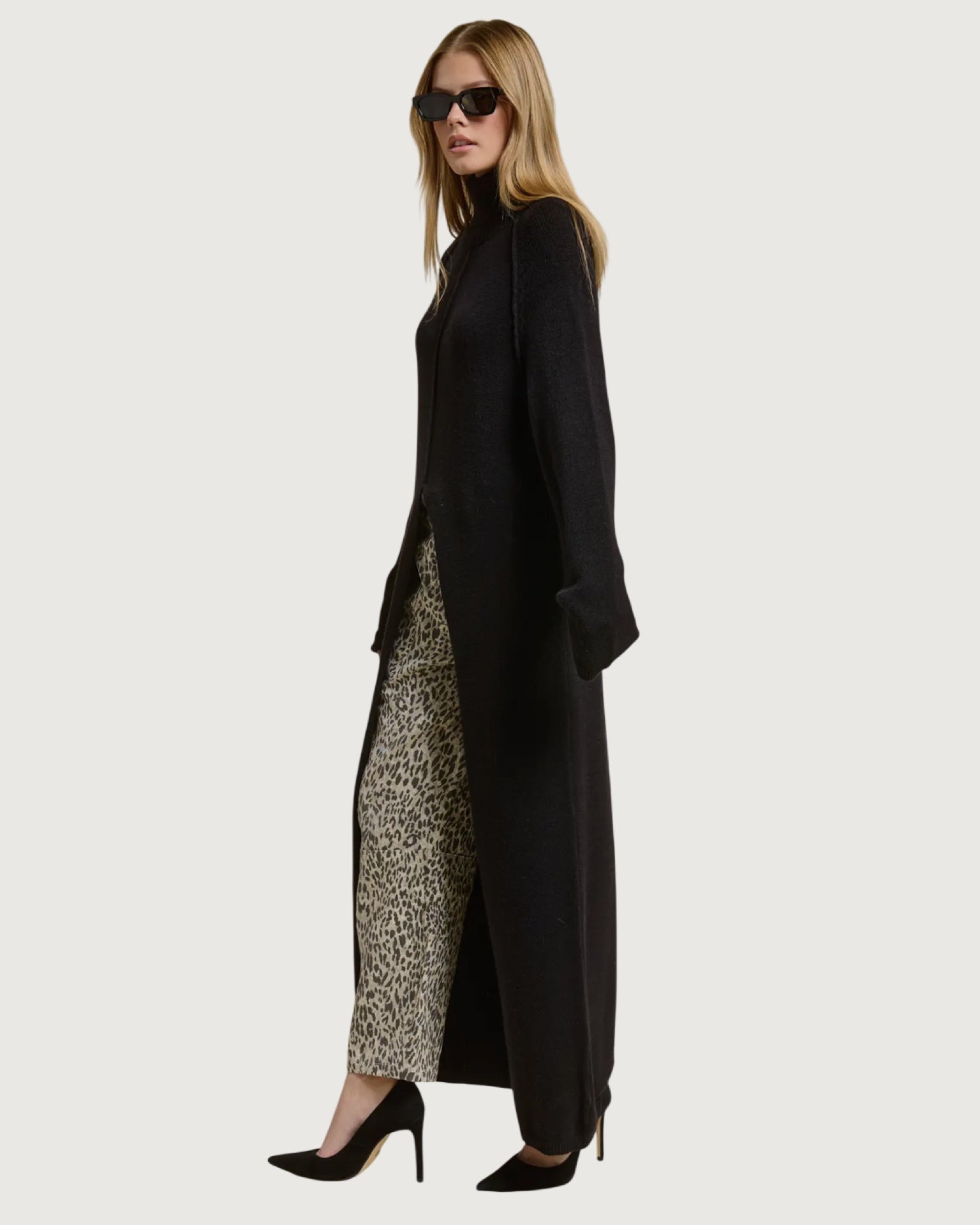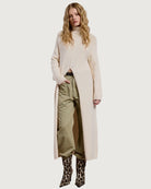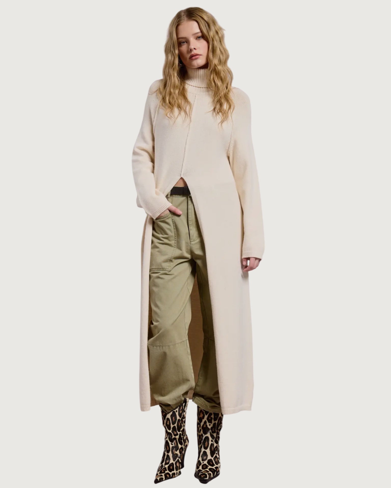 mid length tunic sweater dress with front slit detail, exposed seam detailing down the shoulders and front