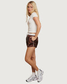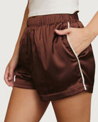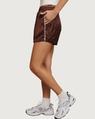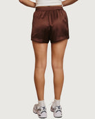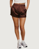 brown satin-like track shorts, drawstring waistband