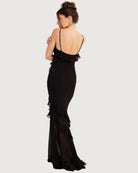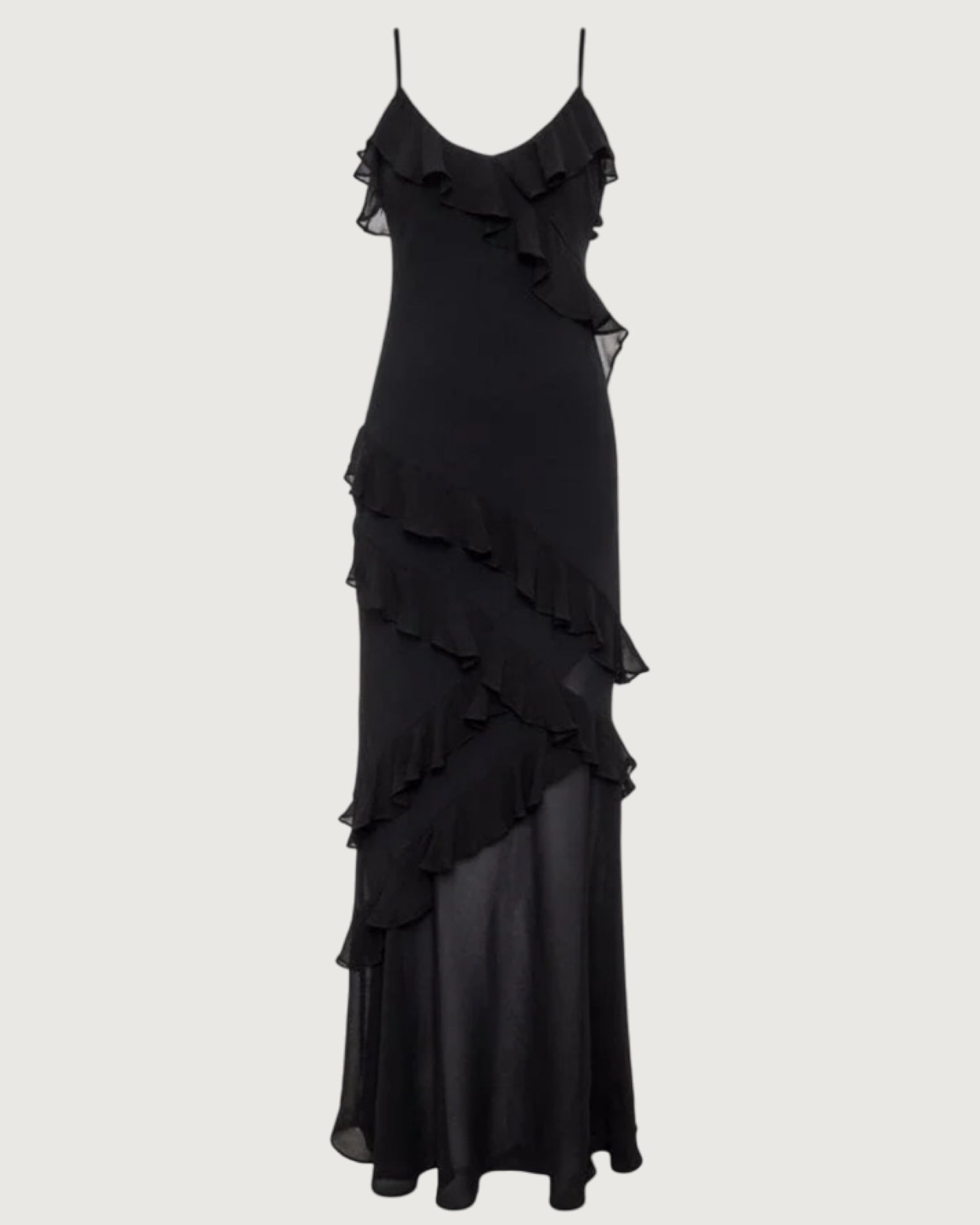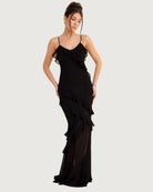 v-neck, bias cut, mermaid hem, adjustable straps, hidden zipper, fully lined, flounce detail throughout