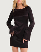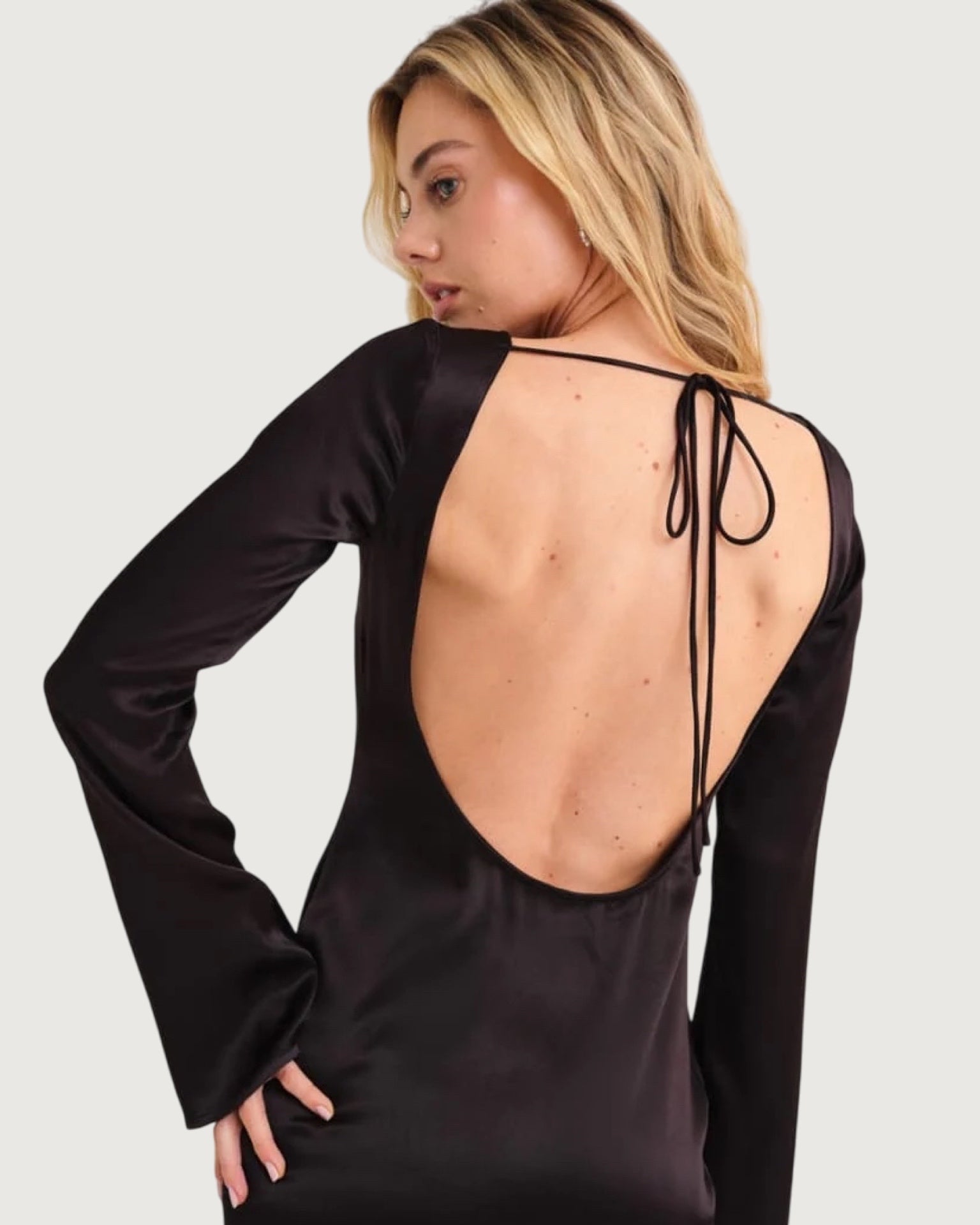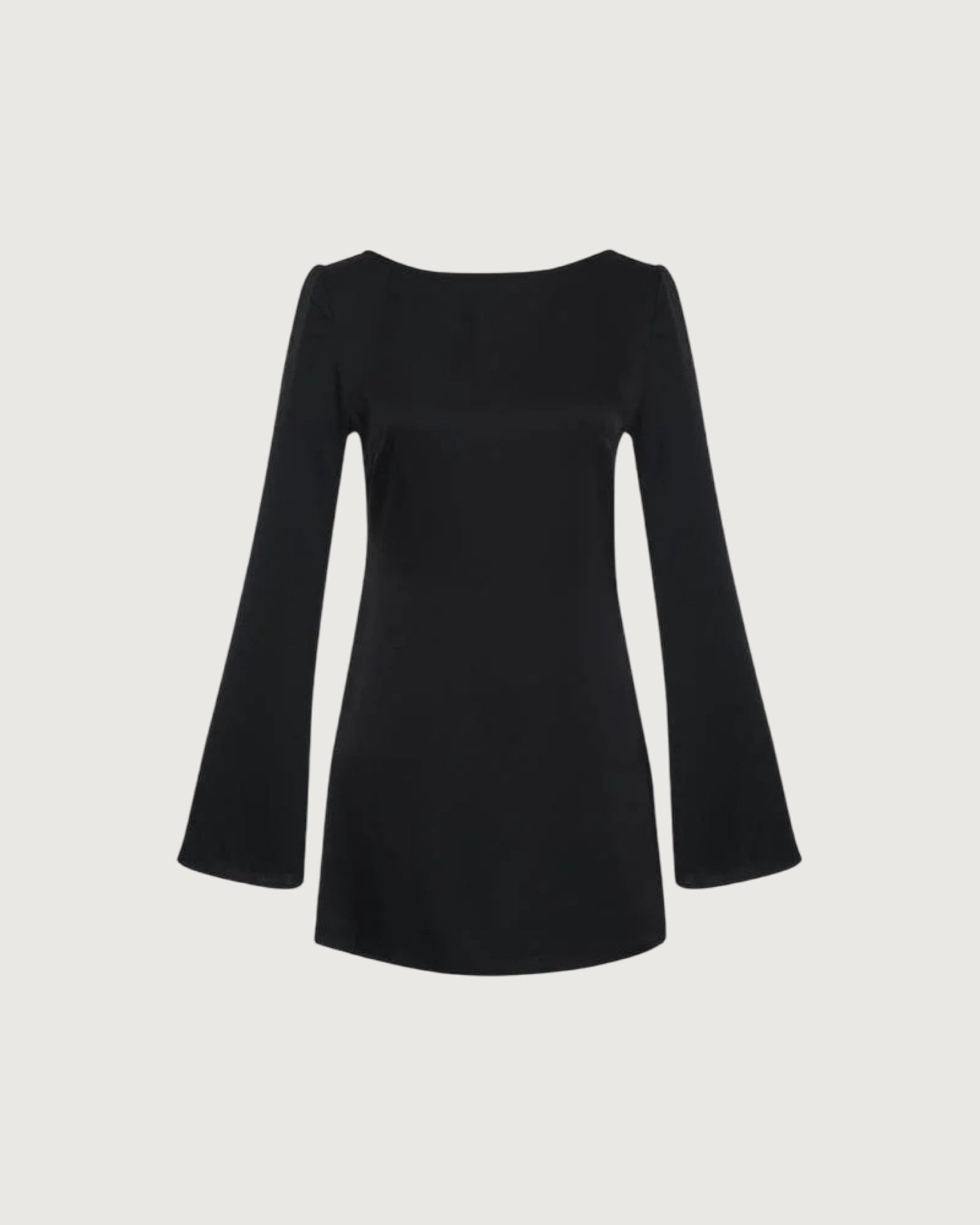 boat neck, open back with tie closure, body skimming, bell sleeve