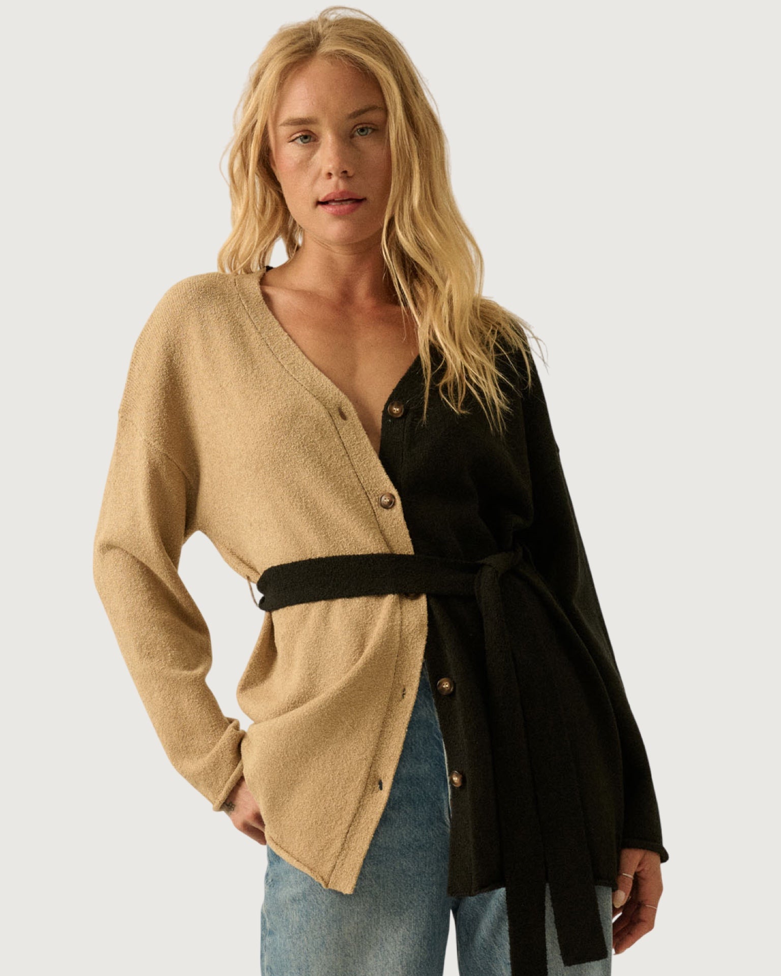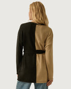 textured two-tone color block, relaxed fit, button closure, drop shoulder, removable tie belt, rolled cuffs and hem