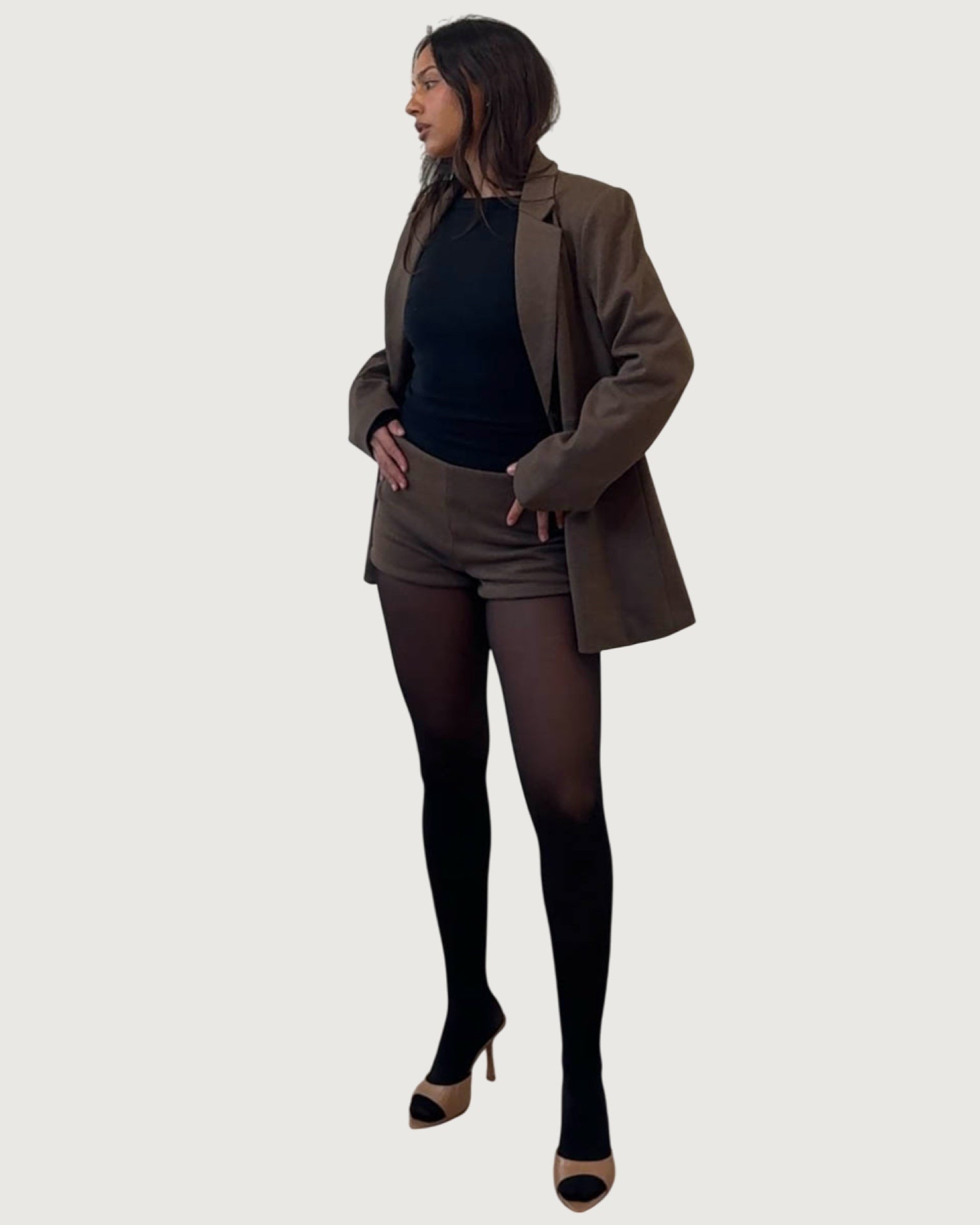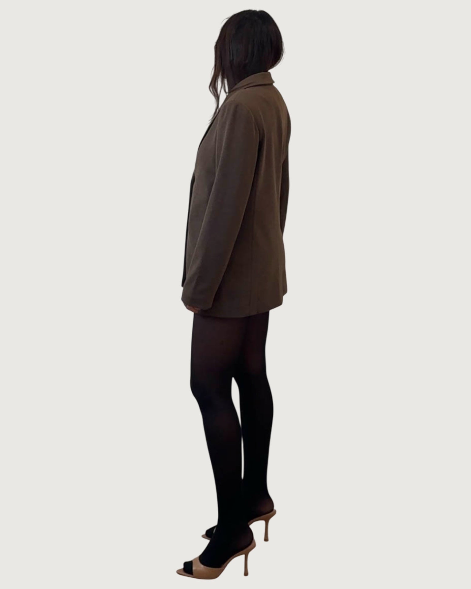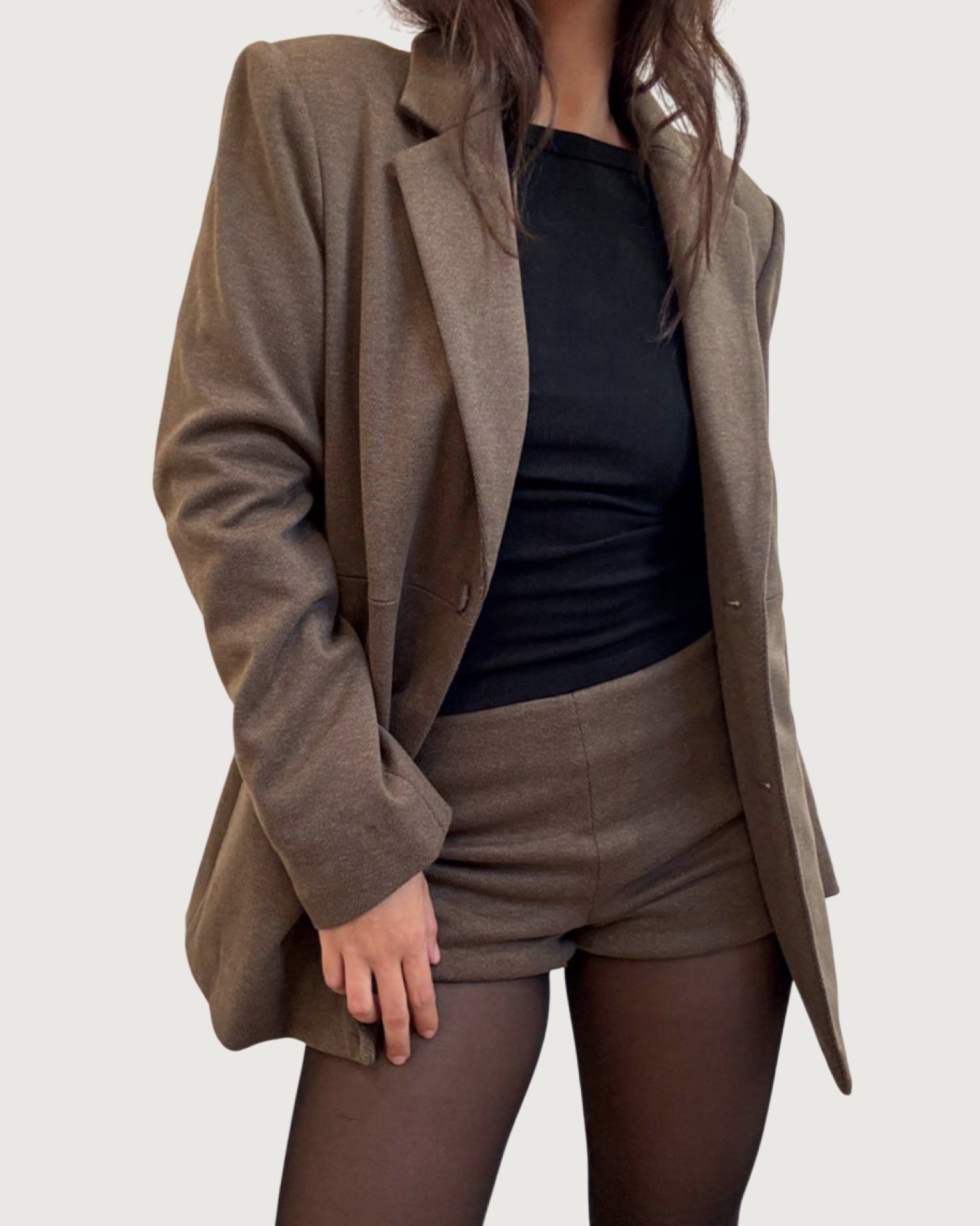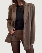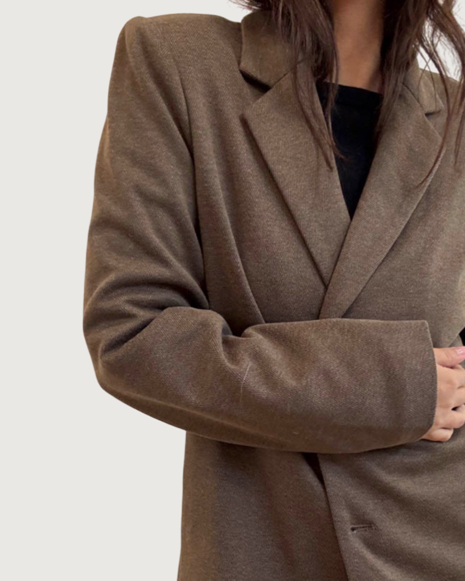 slight oversized fit, padded shoulders, single front button closure