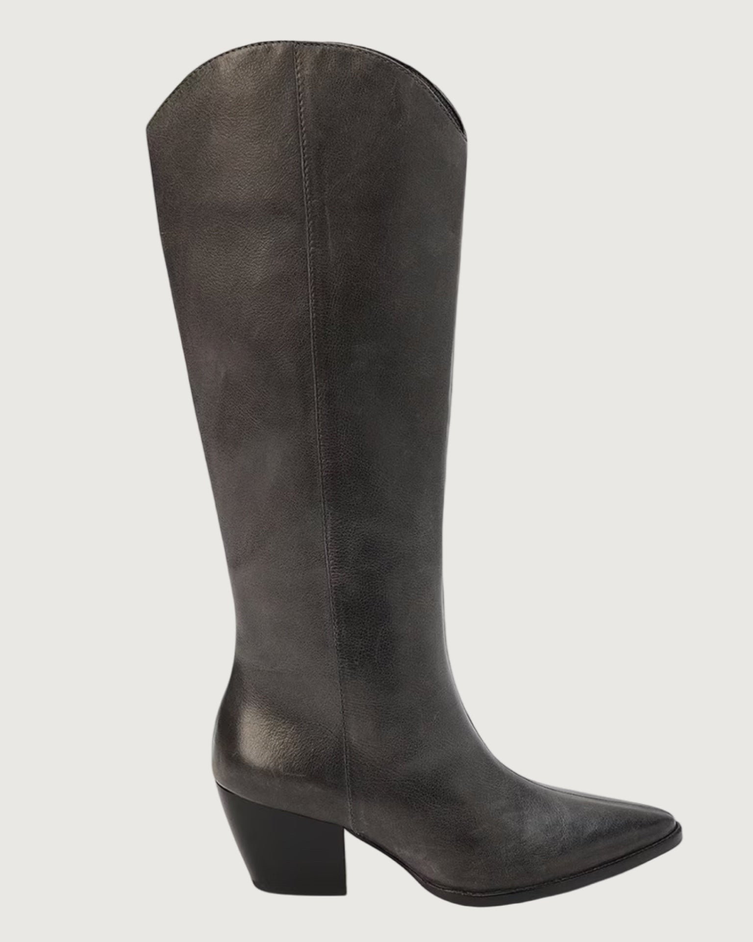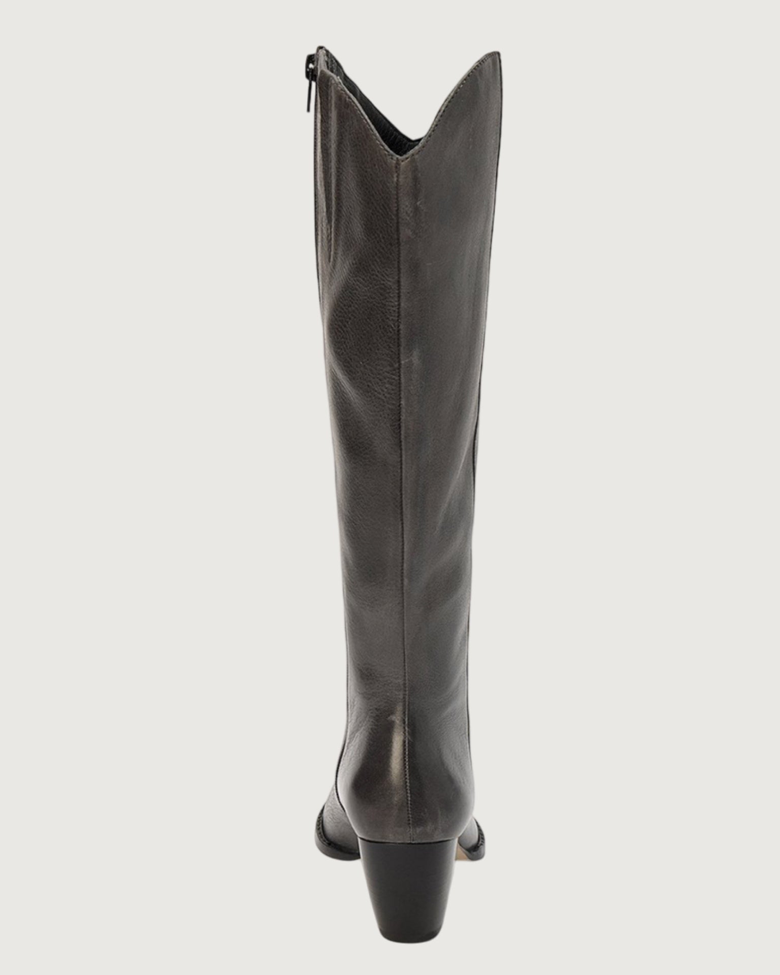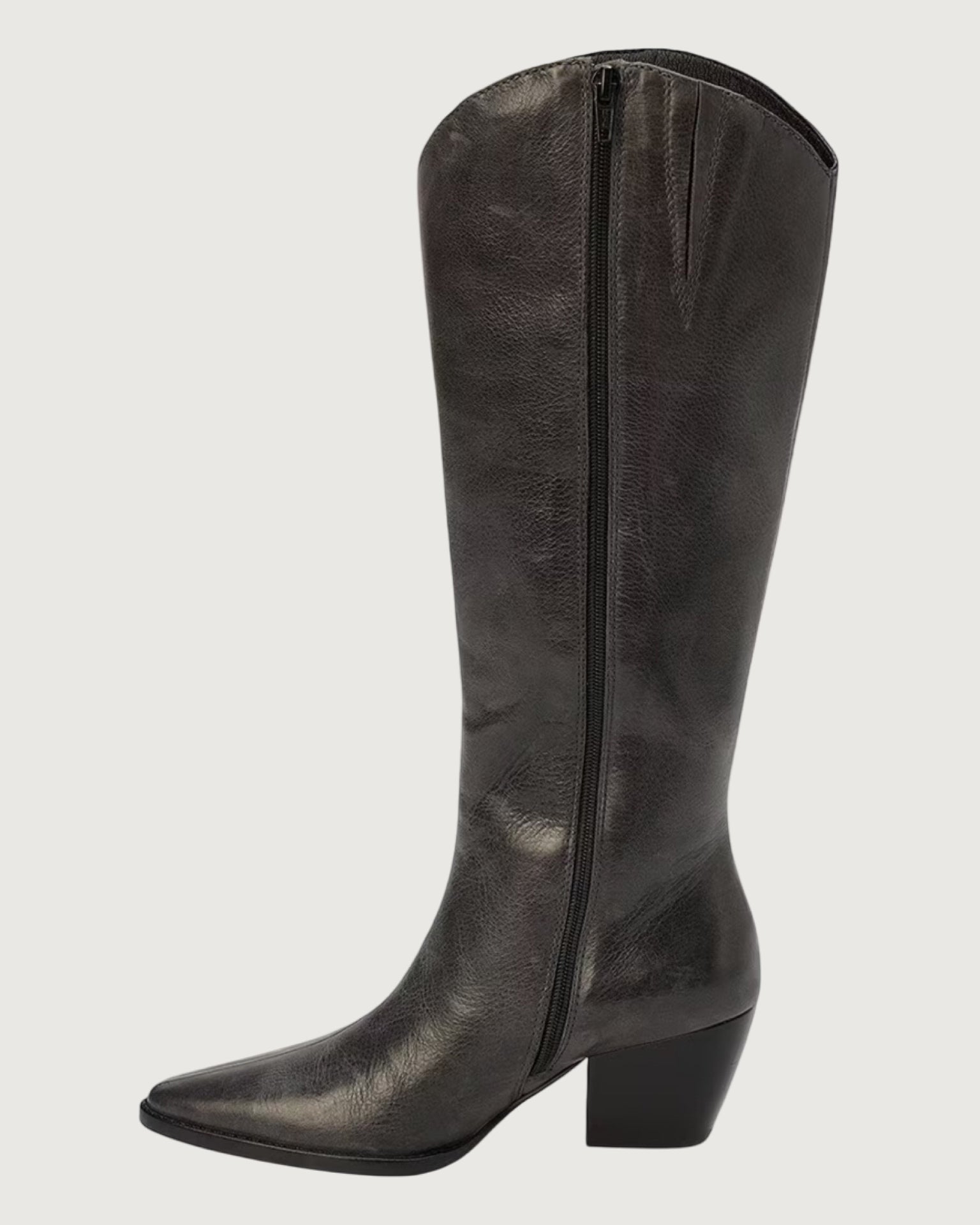 smoke grey leather upper, inside zipper closure, textile lining, padded insole