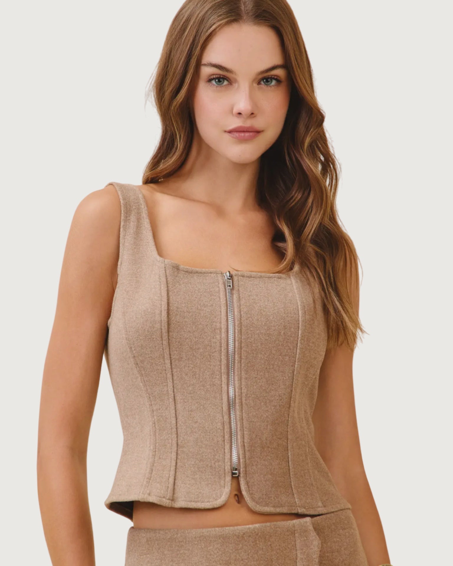square neck, zip front closure