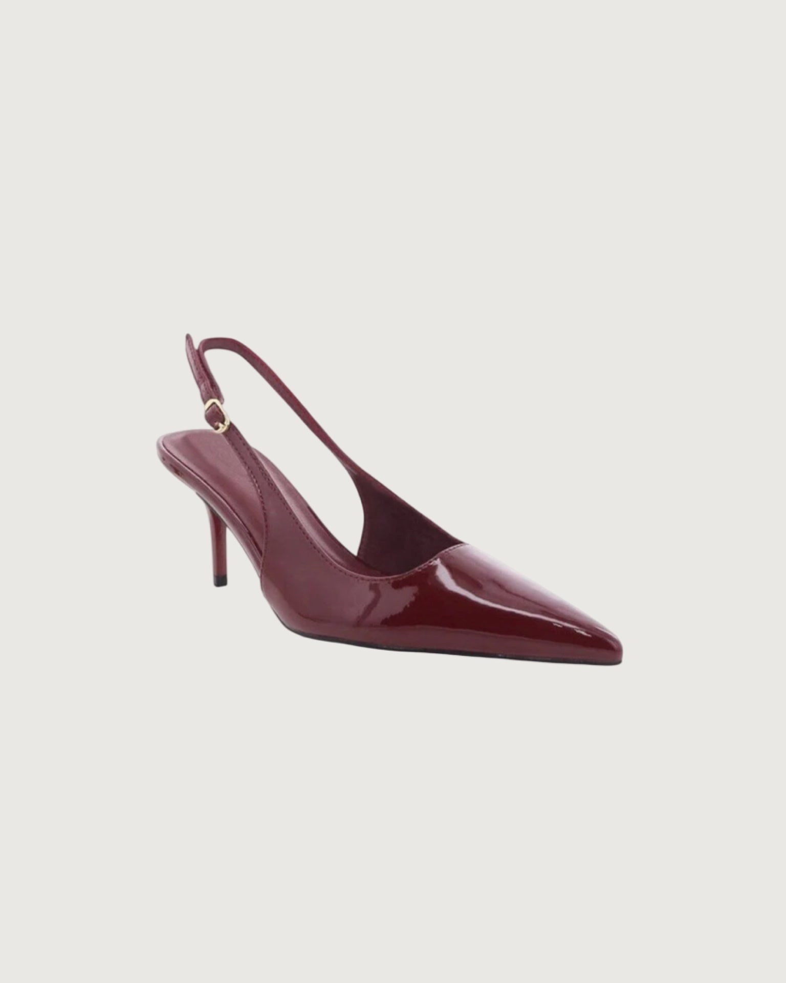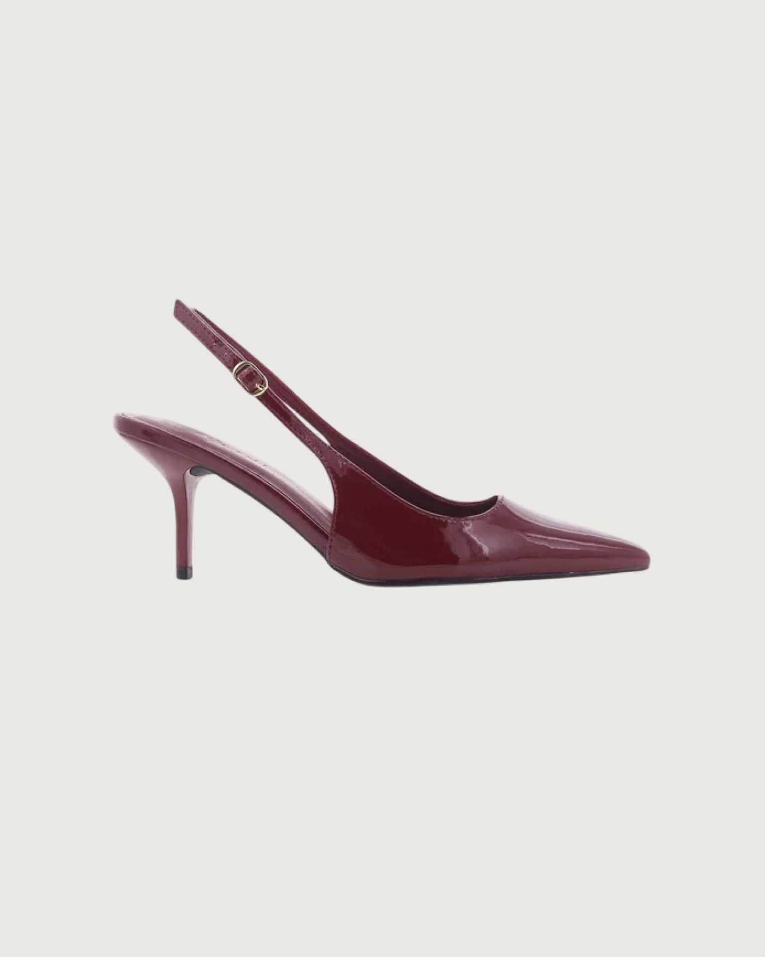 mid kicked in stiletto heel, closed pointed toe, simple court style upper, adjustable sling back strap with buckle fastening