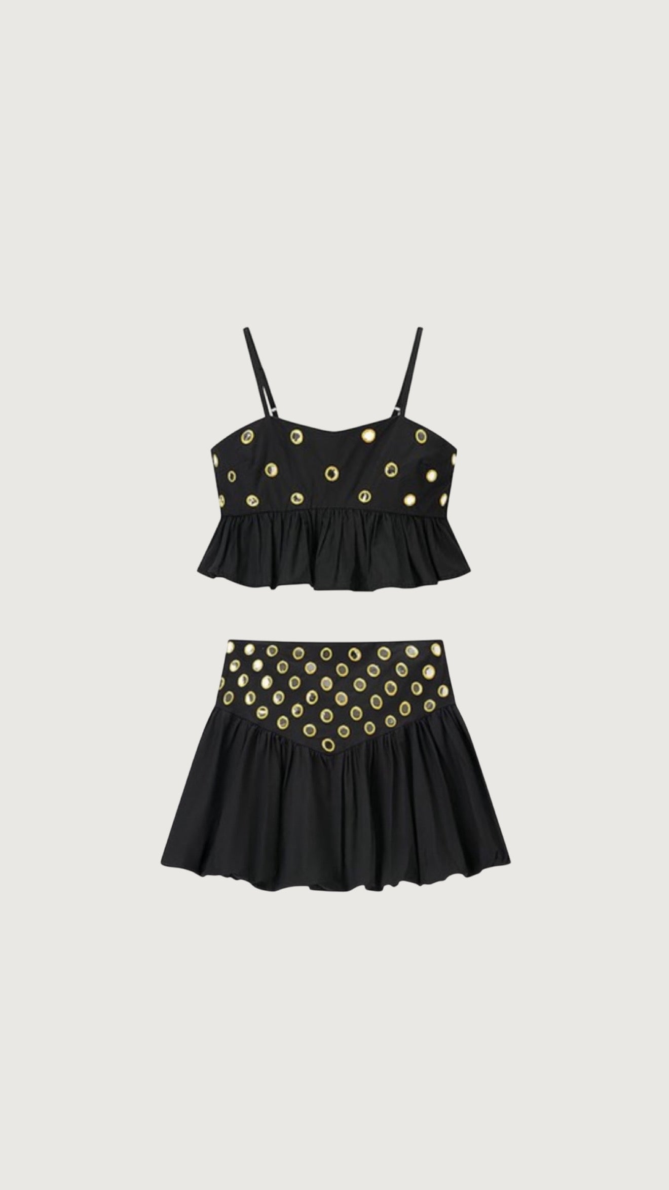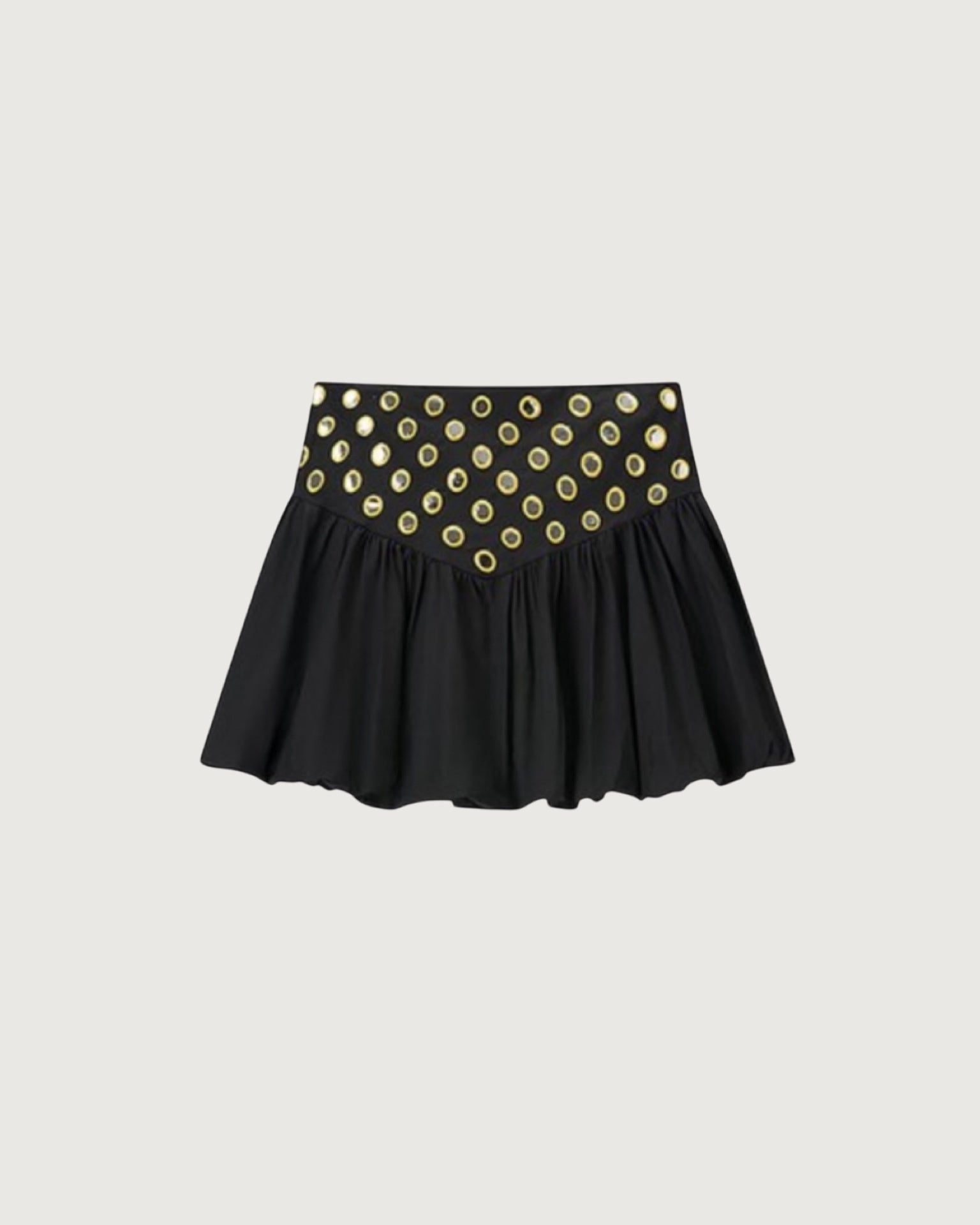 mini skirt with drop waist and bubble hem, fully lined, mirrored grommet detail, back zipper closure