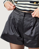 high waisted satin shorts, relaxed fit, pockets, zipper with hook + bar closure