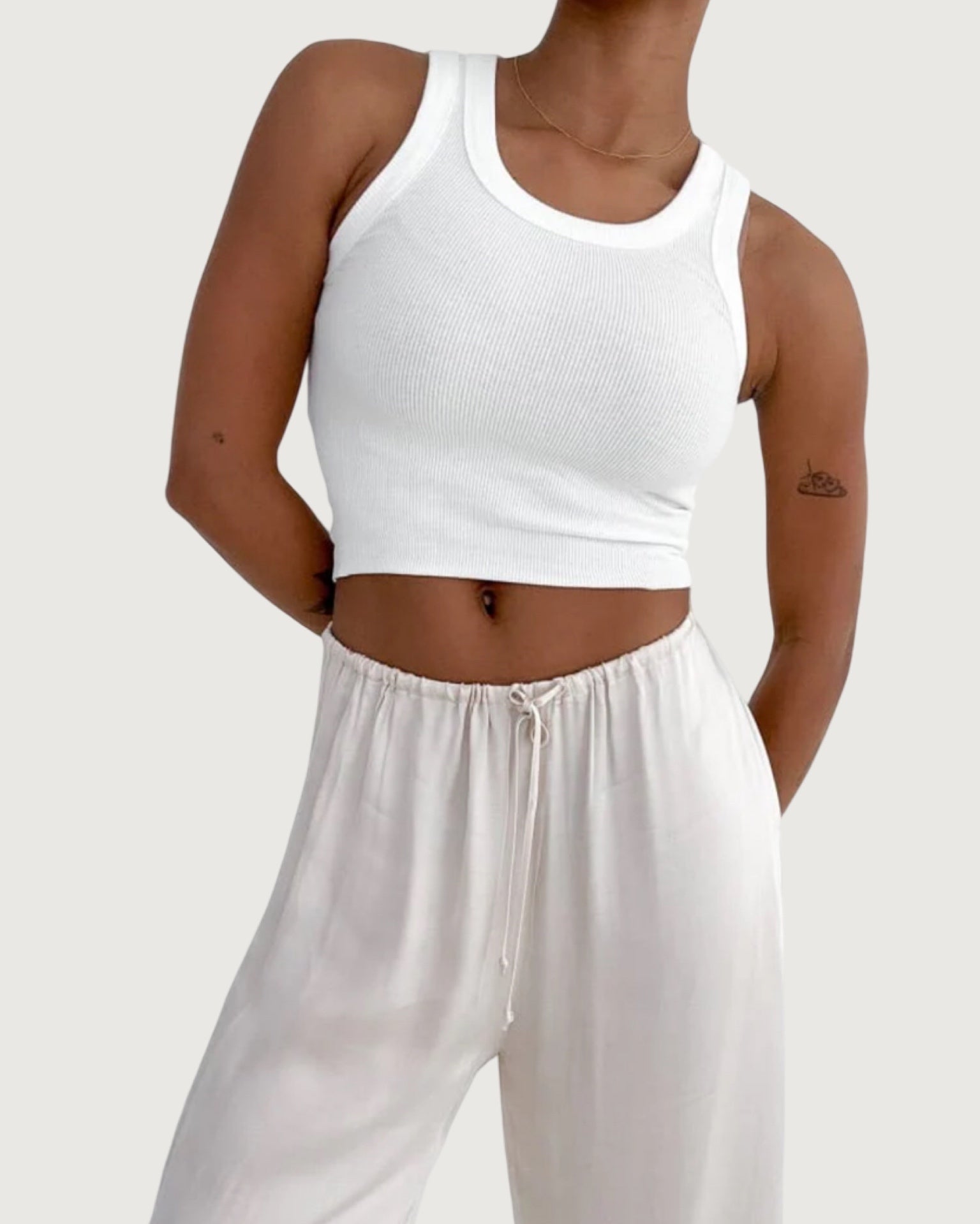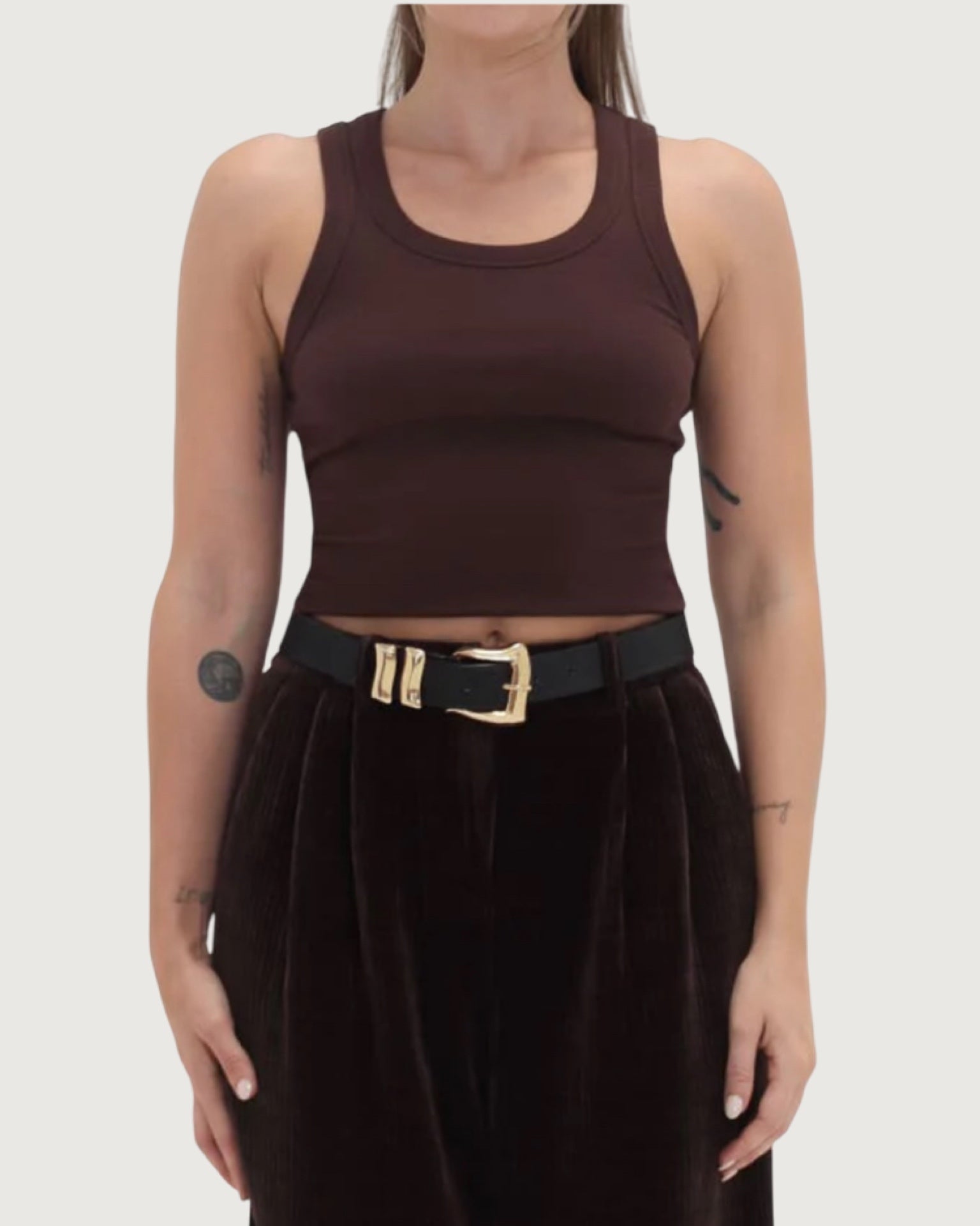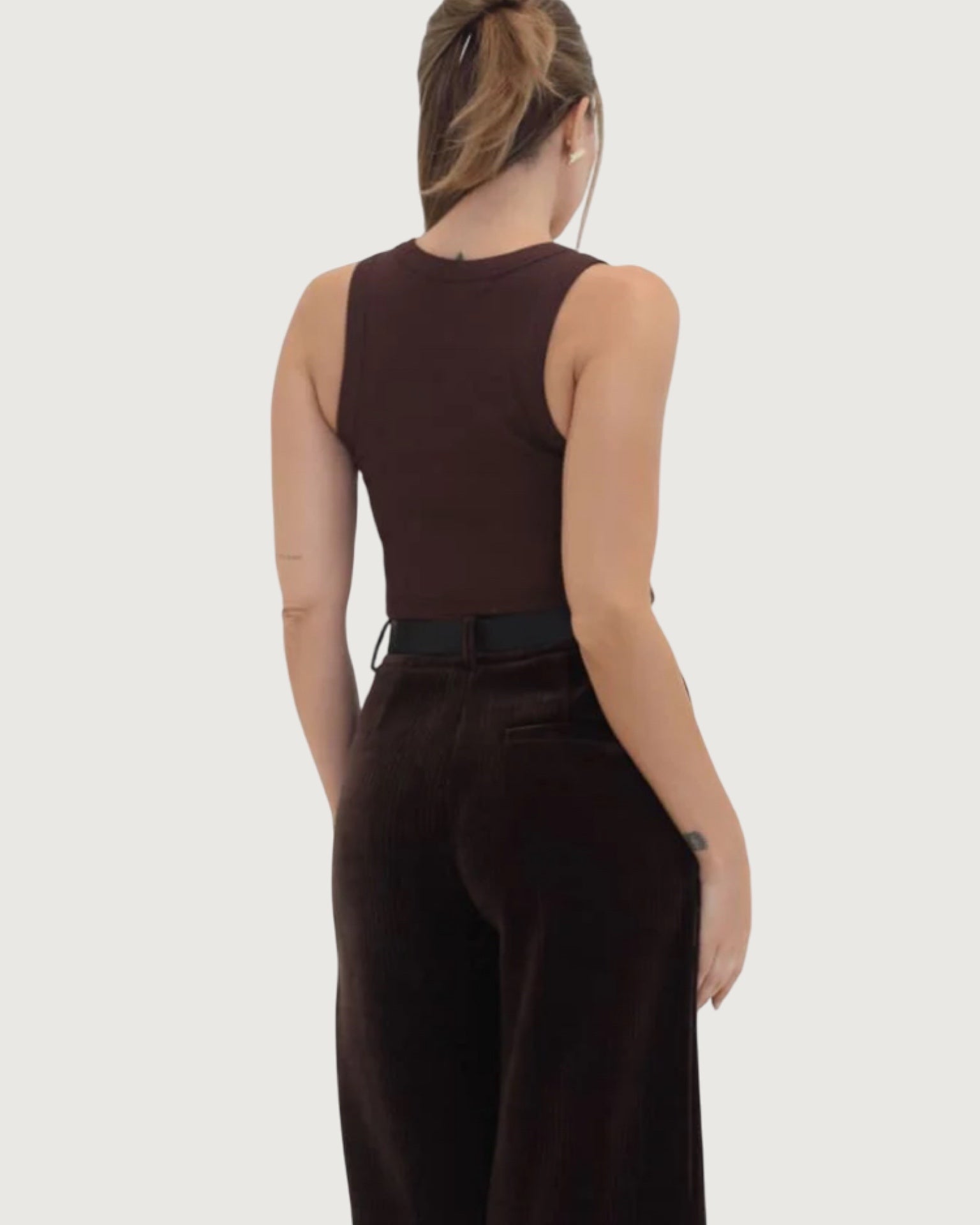 wide binding neck and armhole trim, heavy weight ribbed fabric, lots of stretch and compression, raw hem